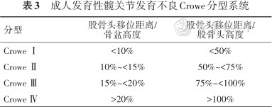 成人DDH目前已有多种分型系统,其中最常用的是Crowe分型系统[90]。Crowe分型是一种定量分型,基于股骨头移位距离与股骨头及骨盆高度的比例将DDH分为4种不同类型(表3)。另一种常用的成人DDH分类系统由Hartofilakidis等[91]提出。与Crowe分型不同的是,Hartofilakidis分型是一种定性分型,它依据髋关节的X线表现分为发育不良、低脱位和高脱位(表4)。
