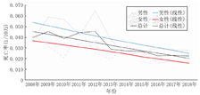 儿童哮喘严重性发作可导致死亡,世界卫生组织(World Health Organization,WHO)公布5~14岁儿童哮喘死亡率为0~0.7/10万[17]。我国2008年至2018年0~19岁人群哮喘死亡率及变化趋势如下[18]:(1)哮喘死亡率为0.023/10万~0.046/10万,估算全国共有1 158名患儿因哮喘死亡。2009年和2012年哮喘死亡率最高(0.046/10万),2018年最低(0.023/10万),与2008年相比,2018年的死亡率降低了42.5%。(2)我国哮喘死亡率总体呈下降趋势,与全球变化趋势一致。与其他国家相比,我国儿童哮喘死亡率较低。2008年至2017年美国0~17岁人群哮喘死亡率为0.244/10万~0.297/10万,其中2017年为0.25/10万,约为中国死亡率的10倍。(3)女性死亡率整体低于男性,且下降幅度高于男性[18],见图1。