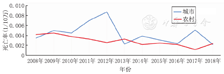 2008年至2018年中国城市与农村0~19岁人群哮喘死亡率现状:(1)城市人群哮喘死亡率整体高于农村,仅在2008年、2013年、2018年低于农村;(2)城市和农村儿童哮喘死亡率均呈下降趋势,与2008年相比,2018年城市哮喘死亡率降低了37.14%,农村降低了42.86%[18],见图2。