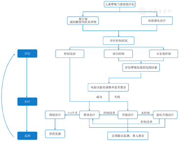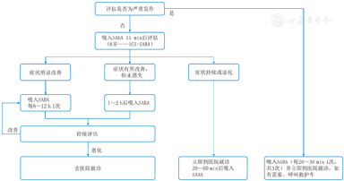 哮喘控制不佳原因之一是未充分认识到家长与患儿在哮喘管理中的重要地位[8]。要重视医院之外的哮喘管理。儿童哮喘管理的核心是哮喘儿童的自我管理(幼儿是家长),患儿必须处于控制哮喘所有努力的中心。哮喘自我管理的主要内容包括哮喘自我管理相关的健康教育(哮喘疾病知识、哮喘的预防和治疗、吸人装置的使用指导和培训、用药和随诊的依从性教育等)、哮喘自我管理的工具(哮喘控制测试评分表、PEF、哮喘日记及WAAP)、哮喘急性发作先兆的识别和处理3个方面[284]。临床医师作为儿童哮喘控制的主要参与者,大部分时间都在卫生保健领域之外,需要建立以社区为基础的卫生保健体系,由临床医师、社区卫生保健、家庭、老师等共同协助儿童哮喘的管理。社区在活动场所、策略方案实施等各个环节提供必要的支持,旨在全面改善和提高儿童和家庭的生活质量。基于社区的干预措施有效改善儿童哮喘控制流程见图10。