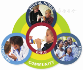 2016年美国过敏、哮喘和免疫学学会(AAAAI)与美国学校护士协会合作,开发了基于学校的哮喘管理计划(school-based asthma management program,SAMPRO),并与国家合作伙伴进行了广泛的认可和传播,值得我们借鉴[303]。SAMPRO包含以下4个方面的内容:(1)支持圈:患儿、家属、临床医师和学校护士之间沟通的协调模式(图11)。①在家庭、临床医师和学校护士之间建立围绕儿童的伙伴关系和沟通渠道;②确保临床医师在学年开始时开发个性化的AAP、药物和完整的授权表格,以优化系统监控和学校哮喘药物的提供;③通过哮喘教育项目对学校护士和家庭进行教育;④减少支持圈所有成员之间的沟通障碍。