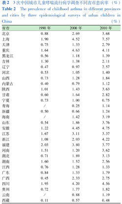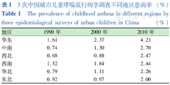 1990年、2000年和2010年3次城市儿童哮喘流行病学调查显示,累积患病率分别为1.00%[4]、1.97%[5]、3.02%[6],呈现明显增长趋势。