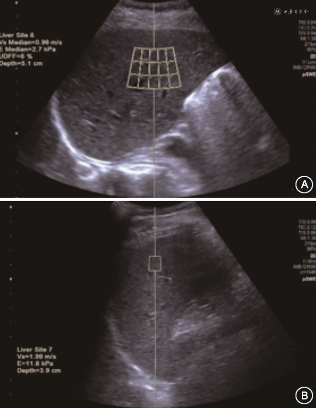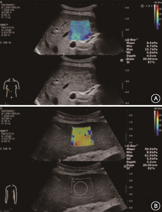 2D-SWE和p-SWE测量时,取样框应置于肝脏实质回声均匀处,避开大血管、胆道及肋骨,取样框尽量平行于肝包膜,放置在肝包膜下方1~2 cm,不超过6 cm处[30, 31, 32,34]。2D-SWE测量LSM时,取样框内填充的彩色信号需超过三分之二,Q-Box优先放置在弹性图的中央位置,建议Q-Box直径≥1.5 cm[31, 32](图1A,图2A)。
