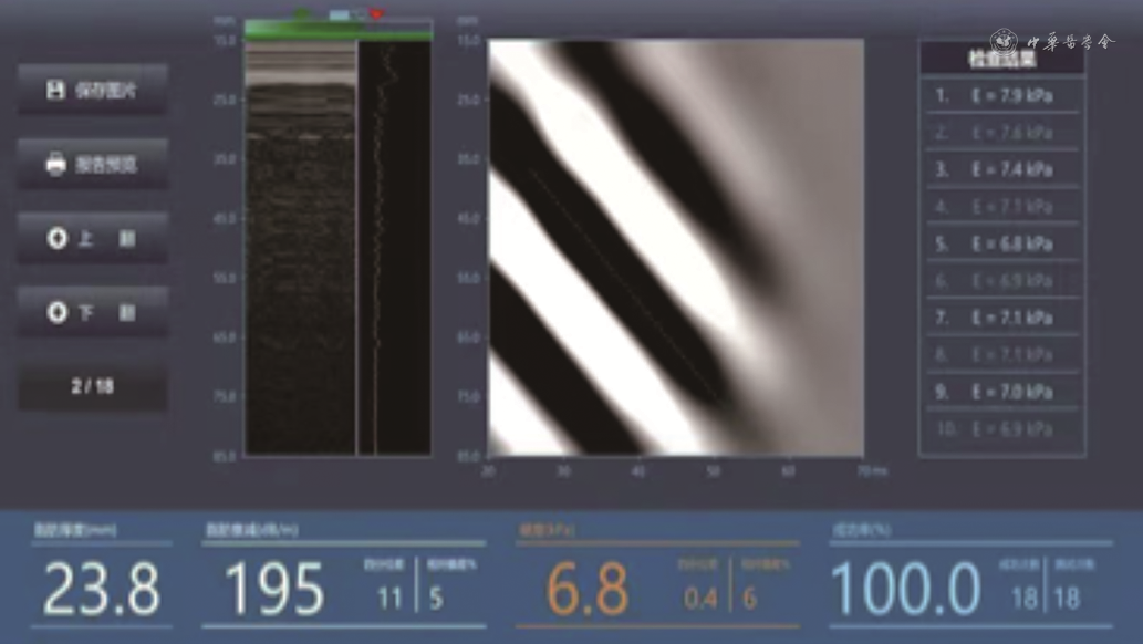 推荐意见8:弹性测量应避开肋骨声影、气体、管道结构,切勿深吸气后屏气,在连续多幅弹性图像稳定时再冻结测量(A,1)。