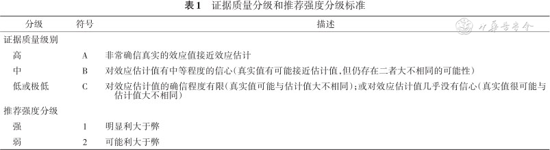 本共识参考证据质量分级和推荐强度系统(the Grading of Recommendations,Assessment,Development,Evaluations;GRADE),将证据质量分为高(A)、中(B)、低或极低(C)3个等级[8, 9, 10, 11, 12, 13, 14, 15](表1)。来自我国多学科的78位专家参与了共识制订。推荐强度的形成采用GRADE网格法,即基于推荐意见评分表(表1),参会专家进行投票,将推荐强度分为强推荐(1)和弱推荐(2)[16]。由秘书组代表首先陈述每条推荐意见基于的证据质量、患者价值观和偏好的调查数据,然后对推荐强度进行投票。投票全部在线完成(基于问卷星网络调查问卷系统)。