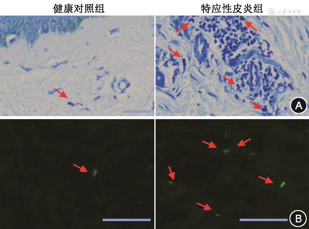 通过甲苯胺蓝染色,相对于健康对照,AD患者皮损中肥大细胞数目增加,每高倍视野下健康对照皮肤中肥大细胞数目为(2.20±0.84)个,AD患者皮损中肥大细胞的数目为(5.40±1.14)个,差异有统计学意义(t=5.06,P<0.001)(图1A)。通过Avidin免疫荧光染色,AD皮损中活化的肥大细胞数目也增加,每高倍视野下健康对照皮肤中脱颗粒肥大细胞数目为(1.00±0.71)个,AD患者皮损中脱颗粒肥大细胞的数目为(4.20±0.84)个,差异有统计学意义(t=6.53,P<0.001)(图1B)。