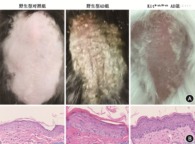 通过分别构建C57BL6/J野生型小鼠和KitW-sh/W-sh肥大细胞缺失小鼠AD皮炎模型,发现KitW-sh/W-sh小鼠的表型减轻,表现在干燥程度减弱,鳞屑减少,苔藓化程度减轻(图2A)。对照组小鼠ADI评分为(1.83±0.75),野生型AD小鼠ADI评分为(10.00±0.89),KitW-sh/W-shAD小鼠ADI评分为(5.50±1.05),差异有统计学意义(F=4.50,P<0.001)。通过苏木精-伊红染色法(hematoxylin-eosin staining,HE)染色,发现KitW-sh/W-shAD小鼠与野生型AD小鼠相比,表皮组织病理改变减轻,表现为真皮浸润炎症细胞减轻(图2B)。