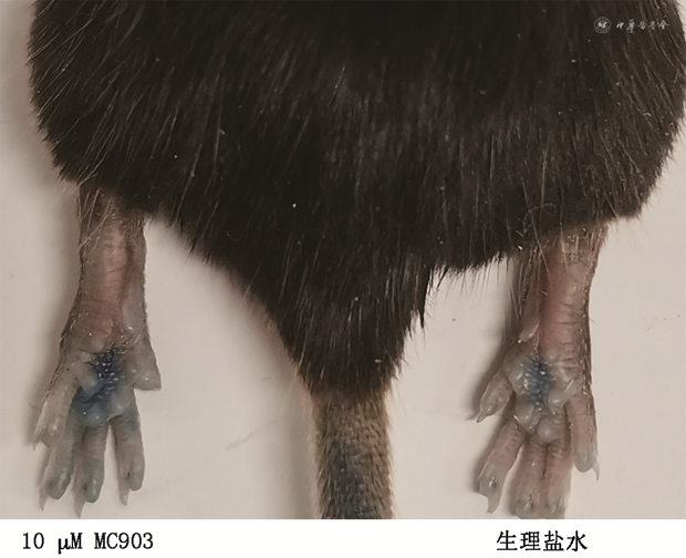 雄性C57BL/6小鼠通过腹腔注射80 mg/kg 1%戊巴比妥钠进行麻醉。麻醉诱导后15 min,每只小鼠尾静脉注射0.2 ml生理盐水中的0.4%埃文斯蓝染料(evans blue dye,EBD)。在注射之前,用游标卡尺测量爪子的厚度。5 min后,用微型注射器向左爪注射5 μl的10 μmol/L MC903,并仅向右爪注射生理盐水作为空白对照。15 min后,再次测量并记录爪子的厚度。然后用CO2处死小鼠,并获得每个爪子的照片。收集爪子组织,在50 ℃下干燥24 h,然后称重。用500 μl丙酮-盐水(7∶3)在37 ℃下孵化12 h,提取EBD。将组织切成碎片,在超声波机中放置10 min,并在1 000×g,离心半径为10 cm下离心20 min。将上清液以200 μl的等分量平均分配到96孔细胞培养板中,用分光光度计在620 nm处读取吸光度A值。