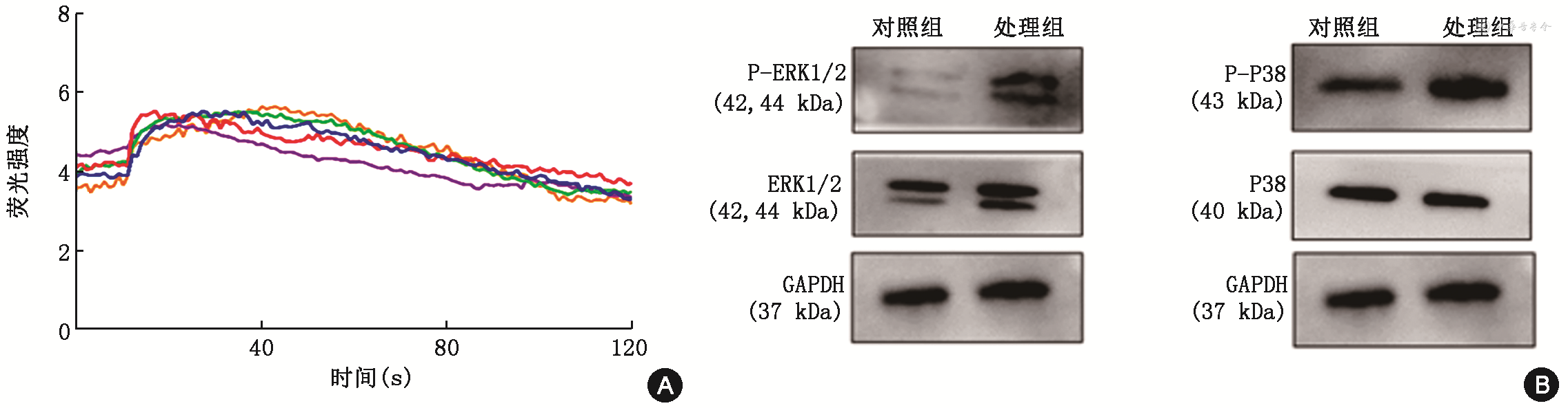 每孔1×105个MPMC,在96孔板中进行接种,在每孔加入200 μl的DMEM完全培养基,置于37 ℃和5% CO2的培养箱过夜。次日,显微镜下确认细胞已贴壁并且状态良好后,用100 μl/孔钙成像缓冲液冲洗细胞两次。每孔加入100 μl孵育缓冲液,96孔板置于37 ℃和5%的CO2培养箱中孵育30 min。给予Tyrode溶液制备的10 μmol/L MC903刺激后,用荧光酶标仪表征细胞内钙离子浓度的变化。