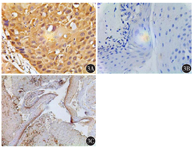 免疫组织化学法检测显示,PAK2在喉癌组织中呈黄色或棕黄色颗粒,主要在胞质中广泛表达,在癌巢及肿瘤细胞集中区域表达较高;PAK2在正常黏膜鳞状上皮组织的基底层表达较为密集(图3)。34例LSCC患者中,癌组织PAK2阳性20例(58.82%),癌旁组织阳性1例(0.03%);20例喉正常黏膜组织中无阳性者;癌组织阳性患者比例较癌旁组织、正常组织均高(均P<0.001)。