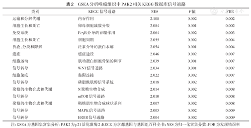 注:GSEA为基因集富集分析;PAK2为p21活化激酶2;KEGG为京都基因与基因组百科全书;NES为归一化富集分数;FDR为发现错误率
