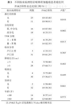 不同临床病理特征喉鳞状细胞癌患者癌组织PAK2阳性表达比较[例(%)]