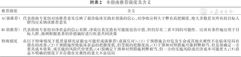 本指南结合证据质量将推荐强度归为强和弱两个等级,分别用A和B表述(附表2)。此外,针对已被广泛认可的最佳临床操作,则采用常规陈述的方式呈现,不另予分级。