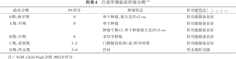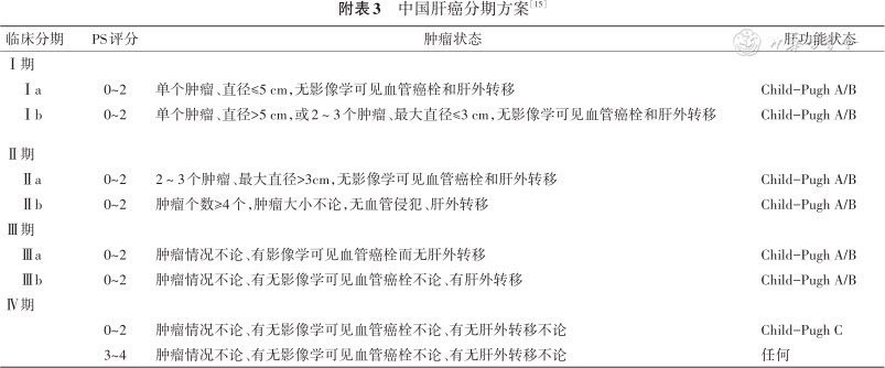本指南中肝癌分期主要依据中国肝癌分期方案(China liver cancer staging,CNLC,附表3)和巴塞罗那临床肝癌分期(Barcelona clinic liver cancer,BCLC,附表4)[15, 16]。