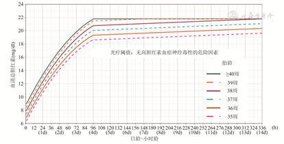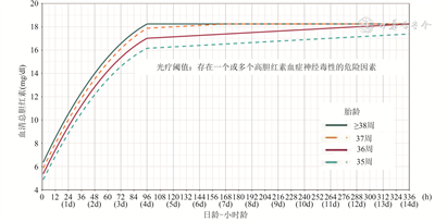 诊治及管理要点10:基于胎龄、高胆红素血症神经毒性危险因素和新生儿小时龄,推荐TSB水平达图2或图3中阈值时进行强光疗。(综合证据质量等级X,推荐)