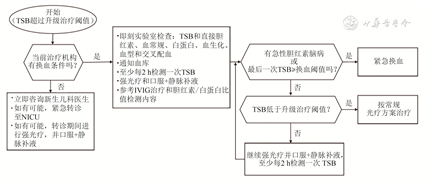 启动升级治疗是医疗紧急情况。升级治疗于新生儿TSB首次达到升级治疗阈值时开始,于TSB恢复到升级治疗阈值以下时结束。升级治疗的新生儿在新生儿重症监护病房(neonatal intensive care unit,NICU)可以得到最佳管理。如果新生儿所在医疗机构缺乏紧急换血设施,则应咨询新生儿科医生是否需要紧急转运至可以进行换血治疗的NICU。如有可能,应在转院期间持续进行强光疗和静脉补液。尽可能直接将新生儿送入NICU,而不是通过急诊转入,以免延误治疗。