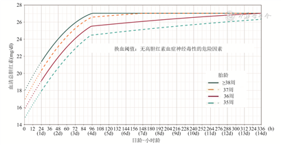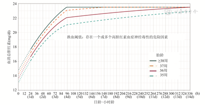 胆红素/白蛋白比值[B/A,TSB(mg/dl)除以血清白蛋白(g/dl)]可与TSB联合应用于评估是否需要换血。换血治疗的B/A阈值受胎龄和存在的高胆红素血症神经毒性危险因素影响,除上述换血标准外,下述情况可考虑换血治疗: