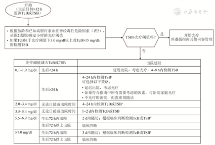 3.出生后住院期间接受过光疗、出院后因超过光疗阈值再次入院的新生儿,应在光疗停止后第二天复查TSB。