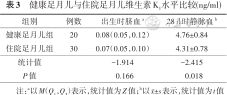 两组脐血维生素K1水平差异无统计学意义(P>0.05);28 d时健康足月儿组高于住院足月儿组,差异有统计学意义(P<0.05)。见表3。
