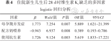 2.多因素分析:将维生素K1异常作为因变量,将单因素分析有意义的因素进行多因素logistic回归分析,结果显示,母孕期并发症和新生儿使用抗生素为新生儿维生素K1缺乏的独立危险因素,配方奶喂养为新生儿维生素K1缺乏的保护因素,见表4。