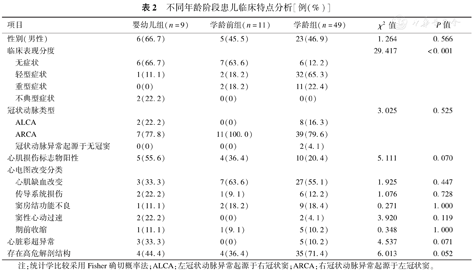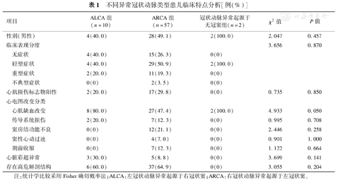 | 项目 | ALCA组(n=10) | ARCA组(n=57) | 冠状动脉异常起源于无冠窦组(n=2) | χ2值 | P值 |