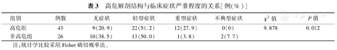 高危解剖结构与临床症状严重程度的关系[例(%)]
