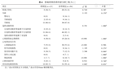 | 项目 | 晕厥组(n=13) | 非晕厥组(n=56) | χ2值 | P值 |
