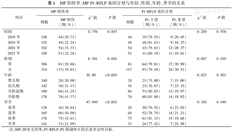 MP阳性率、MP P1-RFLP基因分型与年份、性别、年龄、季节的关系