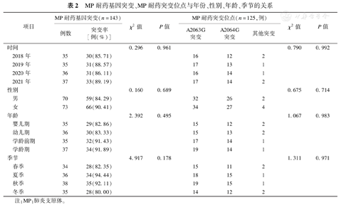 | 项目 | MP耐药基因突变(n=143) | χ2值 | P值 | MP耐药突变位点(n=125,例) | χ2值 | P值 | |||
