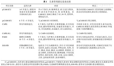 | CAPD | 所有年龄段患儿 | 8个条目:与护理人员眼神接触,有目的的活动,感知周围环境,沟通需求的能力,不安,可安抚程度,活动减少,对互动的回应。 | 不需患儿配合,对发育迟缓儿童均适用;CAPD(R)根据儿童发育特点和PICU环境设置了具体判断要点。 |