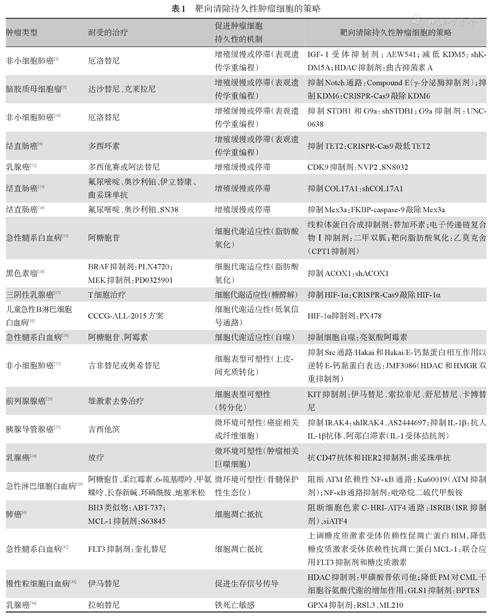 | 肿瘤类型 | 耐受的治疗 | 促进肿瘤细胞持久性的机制 | 靶向清除持久性肿瘤细胞的策略 |