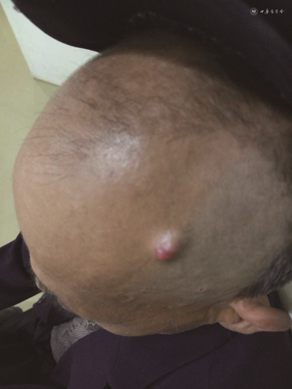 早期研究发现,癌症患者中皮肤转移发生率为5.0%,以皮肤转移作为首发症状者比例仅占0.8% [3]。不同部位皮肤转移的发生率有所不同,胸部(30.3%)、腹部(20.0%)、头皮(12.6%)最常被累及[4]。皮肤转移通常表现为孤立的无痛性结节,临床表现类似良性结节,倾向于发生在原发肿瘤附近[4]。头皮转移癌位居头皮恶性肿瘤第3位(12.8%),仅次于头皮基底细胞癌和鳞癌[5]。头皮转移癌常见于肺癌(23.53%)、结肠癌(11.76%)、肝癌(7.84%)、乳腺癌(7.84%)等[5]。