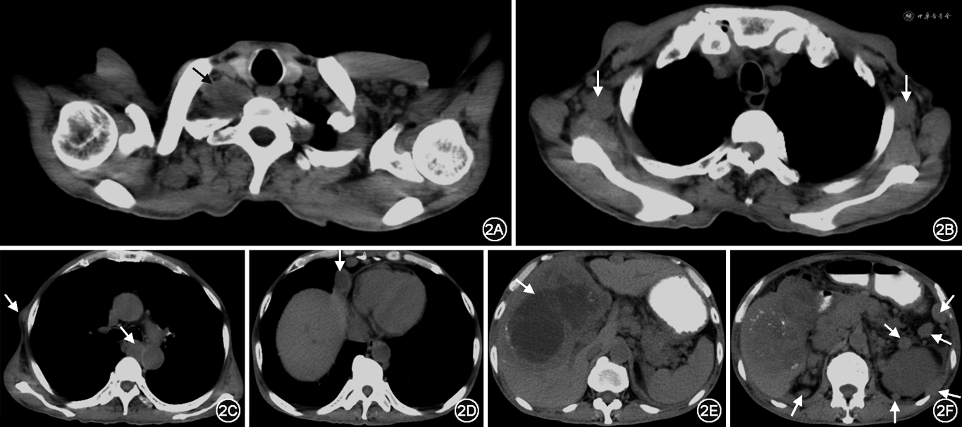 入院后完善相关检查,血常规未见明显异常。肝功能提示低蛋白血症及部分转氨酶升高:血清白蛋白 29.9 g/L,丙氨酸氨基转移酶 86 U/L,碱性磷酸酶 207 U/L,谷氨酰胺转肽酶 151 U/L,乳酸脱氢酶 268 U/L。肾功能结果正常。电解质提示轻度低钠血症:血钠 131.8 mmol/L。肿瘤标志物:癌胚抗原水平11.30 ng/ml,糖类抗原19-9水平27.18 U/ml。胸腹部CT提示:胆囊癌侵及肝脏伴有肝脏多发转移,腹腔、腹膜后多发肿大淋巴结,腹膜转移,腹壁转移,双腋窝、纵隔、右肺门及右侧颈根部多发淋巴结转移,左侧胸腔少量积液,少量腹水(图2)。