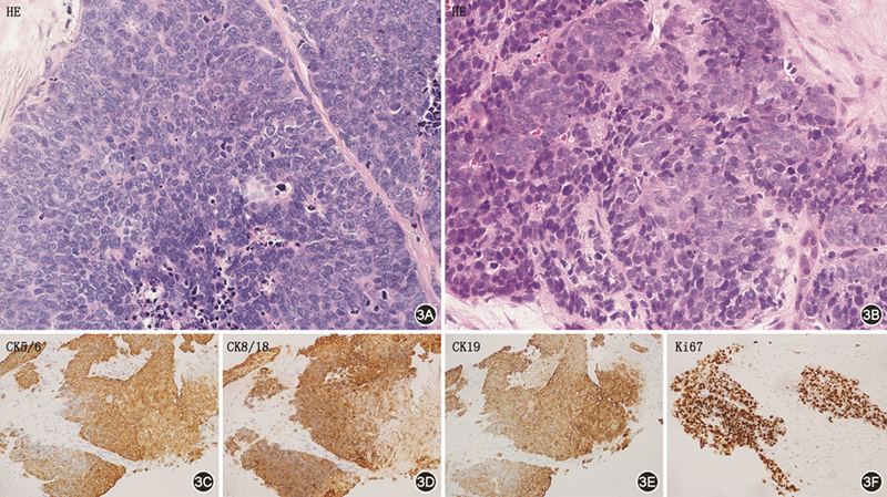 排除禁忌后行左侧头皮结节切除活检术及肝转移瘤穿刺活检。病理报告提示:左侧头皮转移性腺癌;肝脏穿刺组织低分化腺癌,倾向胆囊癌转移;免疫组化:CK8/18(+)、CK5/6(+)、p63(-)、CK7(-)、Glypican(-)、Hep(-)、MOC31(-)、CK20(-)、Ki-67(+约55%)(图3)。结合病史,明确诊断为胆囊癌(腺癌,cT4NxM1期,Ⅳ期),肝转移(多发),皮下转移(头皮、腹壁),淋巴结转移(腋窝、纵隔、颈部、腹腔及腹膜后),腹腔积液。确诊后给予止痛、营养支持治疗,腹腔穿刺引流腹水及腹腔灌注化疗,静脉给予吉西他滨化疗2个周期,疗效评价病情进展。调整治疗方案给予多西他赛联合顺铂静脉化疗1个周期,继续腹腔灌注治疗,但疗效欠佳。此后患者出现不全性肠梗阻、发热、口腔真菌感染等并发症,最终死于循环衰竭,从发病到死亡生存期共3个月。