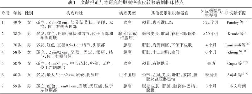 胆囊癌淋巴结转移较为常见,发生率为54%~64%[6]。内脏转移率各有不同,其中肝脏66%、肺15%、骨9%、心脏6%、胰腺5%、肾脏5%、肾上腺5%、卵巢4%、结肠3%和脑2%[7]。但胆囊癌头皮转移极为罕见,文献报道的仅有6例[8, 9, 10, 11, 12, 13],其临床特点如表1所示。