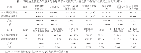 | 组别 | 例数 | 开始用药日龄(d)a | 治疗成功 | 校正胎龄40周 前导管关闭 | 有创通气天数 (d)b | 吸氧天数 (d)a | 肺出血 | 支气管肺 发育不良 |
