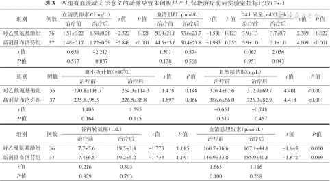 共纳入对乙酰氨基酚组36例,高剂量布洛芬组37例,两组营救治疗成功率差异无统计学意义[80.6%(29/36)比78.4%(29/37),P>0.05]。营救治疗期间,两组上消化道出血、粪便隐血阳性、少尿、Ⅱ~Ⅲ期坏死性小肠结肠炎和Ⅲ~Ⅳ级脑室内出血发生率差异均无统计学意义(P>0.05)。营救治疗后,高剂量布洛芬组血清胱抑素C高于对乙酰氨基酚组[(1.72±0.29)mg/L比(1.58±0.26)mg/L]、24 h尿量低于对乙酰氨基酚组[(3.1±1.0)ml/(kg·h)比(3.7±0.7)ml/(kg·h)],差异均有统计学意义(P<0.05);两组血清肌酐、血小板计数、B型尿钠肽、谷丙转氨酶、血清总胆红素等差异均无统计学意义(P>0.05)。