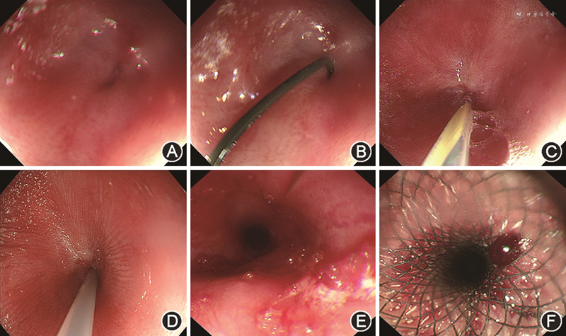 2.内镜诊疗:(1)仪器和设备:胃镜:GIF-XP260NS(日本Olympus公司),外径9.8 mm,直径3.2 mm;黄斑马亲水导丝(美国波士顿科学公司,直径0.89 mm,长度450 cm);导引硬钢丝(南京微创医学科技股份有限公司,直径0.96 mm×长度420 cm)。(2)操作:采用全身静脉麻醉,插入普通胃镜至狭窄口,内镜下发现狭窄口完全闭塞,反复试插导引硬钢丝无果,确认为完全性狭窄,换用黄斑马亲水导丝,在狭窄口最深处或于内镜吸气供气黏膜有波动的地方插入亲水导丝头端,亲水导丝伴随液体滑过最狭窄部位,继续进导丝20~40 cm或更远,沿亲水导丝置入经内镜下逆行胰胆管造影术(ERCP)外套管穿过狭窄部位,远离狭窄部位20~40 cm,退出黄斑马导丝,置换标准导引钢丝至狭窄口下方40 cm左右,保持导引钢丝不移动,退出ERCP导管及胃镜,使用直径为5、7、9、11、12.8 mm的沙氏探条依次扩张,若5 mm首次扩张有阻力,可换用ERCP扩张探条或球囊逐次扩张。扩张完毕后换用胃镜常规检查,根据病变的具体情况,与家属沟通后决定是否植入覆膜支架,若不放置支架,则操作完成(图1)。(3)观察指标:主要观察终点:黄斑马导丝顺利通过狭窄口行导引,置换硬钢丝后成功行内镜下治疗;术后1周内观察是否出现出血、穿孔、移位等并发症。