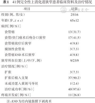 1.一般资料:共纳入41例完全性上消化道狭窄患者,其中东南大学附属中大医院23例,南京医科大学附属第一医院18例。该41例患者中,男25例,女16例,年龄(65±12)岁(28~94岁)。其中,食管癌所致狭窄的有13例,食管癌术后吻合口狭窄17例,食管癌放疗后狭窄4例,食管经内镜黏膜下剥离术(ESD)后狭窄4例,腐蚀性食管狭窄3例。