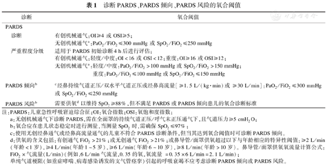 | PARDS倾向b | c经鼻持续气道正压/双水平气道正压或经鼻高流量[≥1.5 L/(kg·min)或≥30 L/min]:PaO2/FiO2≤300 mmHg或SpO2/FiO2≤250 mmHg |