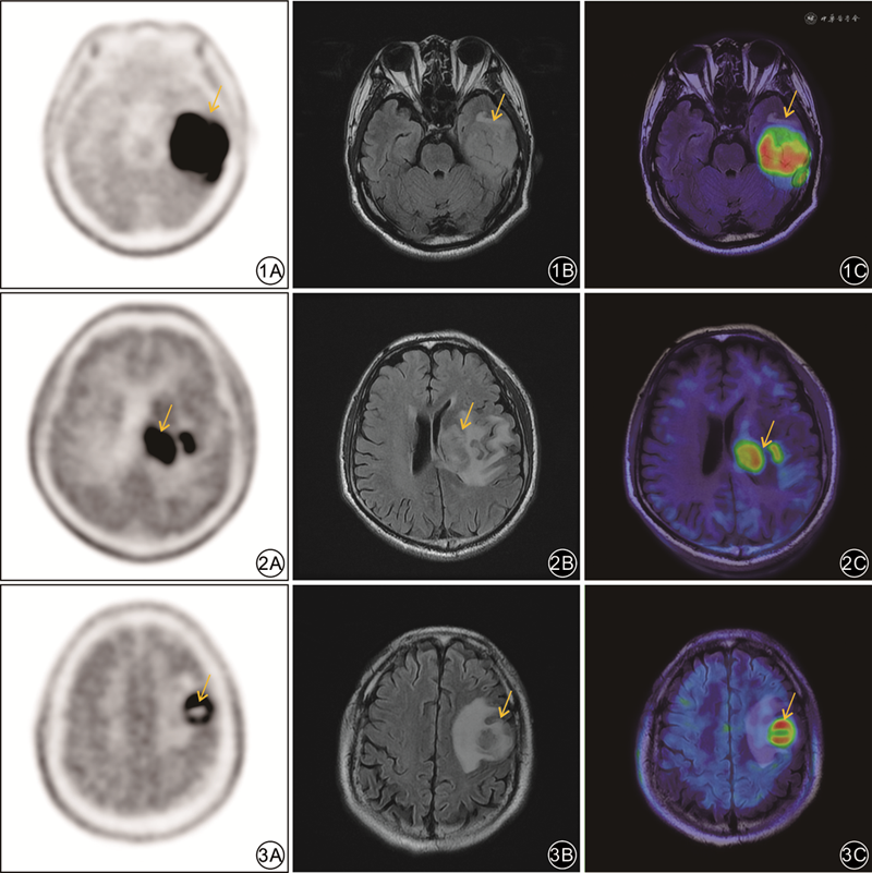 PET/CT利用不同类型的示踪剂反映组织细胞在代谢、分子与受体水平的变化,在脑肿瘤的诊断和鉴别诊断,放疗计划的制定,肿瘤边界的判断,以及预后评价等方面均有重要作用[1]。目前,临床最常用的PET显像剂为18F-氟代脱氧葡萄糖(18F-fluorodeoxyglucose,18F-FDG),但脑灰质的生理性摄取以及非肿瘤性病变(如炎症)的摄取会干扰其用于脑肿瘤的诊断,对靠近灰质的低度恶性肿瘤病灶的显像尤其不理想[2]。氨基酸代谢显像剂11C-蛋氨酸(methionine,MET)、脂肪酸代谢显像剂11C-乙酸盐(acetate,ACE)与核酸代谢显像剂18F-胸苷(fluorothymidine,FLT)等多种新型PET放射性示踪剂的研发应用,或PET与MRI同机或异机融合,可有效弥补这一不足[3]。本研究中,我们通过与11C-MET PET/CT或MRI相比较,探讨异机融合11C-MET PET/MRI在脑胶质瘤初次诊断与治疗后评估中的应用价值,旨在为临床脑胶质瘤的精确诊断提供最优化策略。