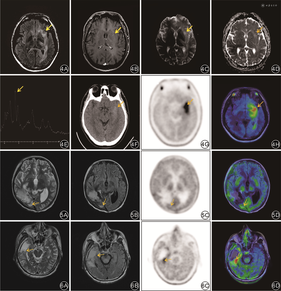 本研究结果显示,11C-MET PET/MRI对原发性胶质瘤初诊的灵敏度(91.7%)较MRI(66.7%)明显提高。初诊组MRI诊断8例假阴性,其中6例将脑胶质瘤误诊为良性病变,11C-MET PET/CT诊断4例假阴性,均将脑胶质瘤误诊为其他病理类型的恶性肿瘤。11C-MET PET/CT诊断脑胶质瘤的假阴性率(16.7%)低于MRI(33.3%),说明MRI可能对病变良恶性的鉴别诊断缺乏特异性;而11C-MET PET/CT在良恶性鉴别方面具有一定优势。然而在某些情况下,11C-MET PET对脑良恶性病变的鉴别也会有困难,主要是由于各种原因造成的血-脑屏障破坏、胶质增生、炎性细胞浸润等,可能会引起良性病变中11C-MET摄取的增加[9],但本研究中未发现类似情况。同时,我们进一步分析了PET/MRI半定量指标在病变良恶性鉴别方面的应用价值,结果发现,除了PET半定量指标SUVmax与T/N具有很大优势之外,ASL半定量指标CBF及MRS半定量指标Cho/NAA在初诊组良恶性肿瘤患者之间的差异也有统计学意义,与以往报道相同[10],说明功能MRI技术对肿瘤良恶性鉴别也具有重要价值。CBF可定量评估脑肿瘤血流灌注情况,在脑肿瘤诊断方面具有一定优势。由于肿瘤异质性,为了满足其异常增生细胞的氧供,血管内皮生长因子表达增加,进而新生血管增多,血流量丰富[11]。但ASL对运动非常敏感,易出现大量伪影[12],临床应用价值有限。MRS也存在一定的局限性:包括要求磁场均匀度足够高以保证其谱线质量,要求成像组织或区域内含脂与含水相对较少,成像体素内尽量避免包含骨板、气窦、血流、脑脊液、金属、坏死、钙化、脂肪、出血等有磁敏感效应的组织结构等[13]。以上因素均可影响分析结果的准确性,导致误诊。本研究中的图1病例是弥漫性脑胶质瘤患者,采用MRS分析其病灶的Cho峰升高、NAA峰稍降低,Cho/NAA比值较对侧轻度增加,考虑为炎性细胞浸润导致的Cho峰升高,因而被误诊为脑炎。