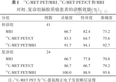 异机融合11C-MET PET/MRI对残留/复发性胶质瘤诊断的灵敏度、特异度和准确度均高于11C-MET PET/CT与MRI,见表1。
