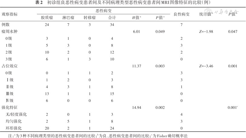 初诊组良恶性病变患者间及不同病理类型恶性病变患者间MRI图像特征的比较(例)