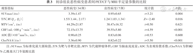 初诊组良恶性病变患者间PET/CT与MRI半定量参数的比较
