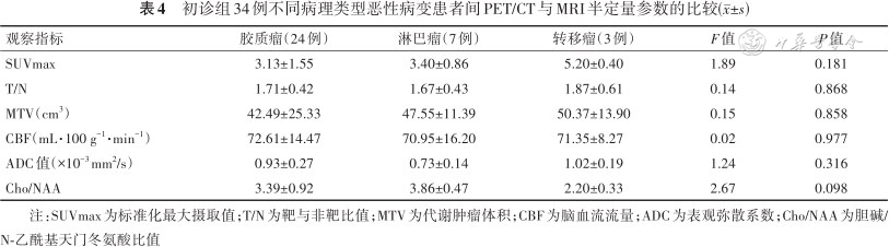 7例良性病变患者与34例恶性病变患者间,以及34例不同病理类型的恶性病变患者间,MRI图像特征比较,包括瘤周水肿、强化特征、占位效应分级比较,差异均有统计学意义(P值均<0.05),见表2。良性病变患者的半定量参数SUVmax、T/N、CBF与Cho/NAA均低于恶性病变患者,差异均有统计学意义(P值均<0.01),见表3;34例不同病理类型的恶性病变患者间各半定量参数比较,差异均无统计学意义(P值均>0.05),见表4。