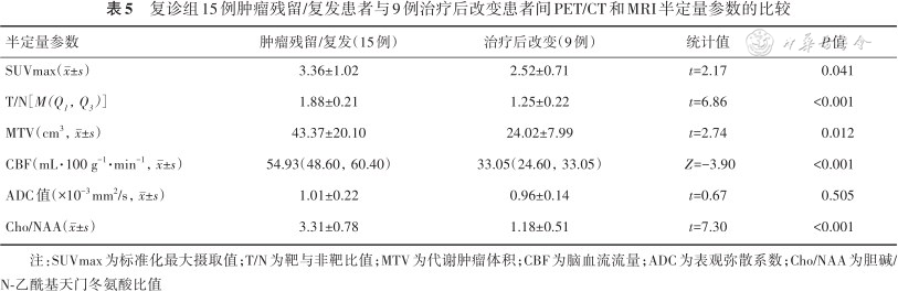 复诊组15例肿瘤残留/复发患者与9例治疗后改变患者间PET/CT和MRI半定量参数的比较