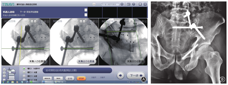 TiRobot的主要临床优势:(1)可规划三维手术方案;(2)机械臂可提供六自由度多向活动,执行端可代替人手掌握内固定物的行进路线;(3)应用"C"型臂X线透视机即可达到手术要求(兼容二维、三维配准),几乎无须借助CT扫描(脊柱骨盆固定除外),因而简化了手术过程;(4)能提供准确的空间定位和路径导航,系统误差≤2 mm,术中几乎无须修正钉道,术后CT证实螺钉误差与术前预期结果基本一致;(5)缩短了手术时间、减少了术中出血及射线暴露;(6)操作简单,便于快速掌握其技术要领。