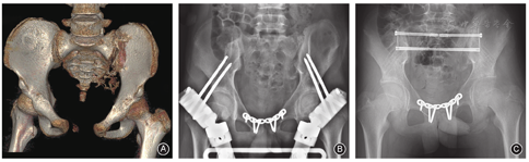 骶髂螺钉可沿钉道轴线均匀分散载荷,是临床公认的治疗骨盆后环损伤的首选方式。骶髂螺钉主要适用于:(1)骶髂关节复合体脱位或骨折脱位;(2)骶骨DenisⅠ、Ⅱ型及部分Ⅲ型骨折;(3)Tile B、C型骨盆损伤;(4)陈旧性骶髂关节脱位或骶骨骨折的截骨矫形;(5)污染相对轻微的骨盆后环开放性损伤;(6)多发伤伴骨盆后环损伤的早期处理;(7)协同髂腰内固定治疗(图3)。