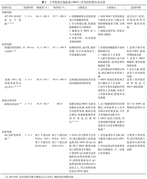 | 直接(DFA)或间接免疫荧光法(IFA)[69,75,76] | 3~4 h | 65.0~94.1 | 99.0~100.0 | 比快速抗原检测法具有更高的敏感度和特异度 | 1.HRSV快速抗原检测方法不能区分A、B亚型2.样本中要有足够的呼吸道柱状上皮细胞;对技术人员要求较高,需要荧光显微镜 | 适用于条件较好的机构进行HRSV感染检测 |